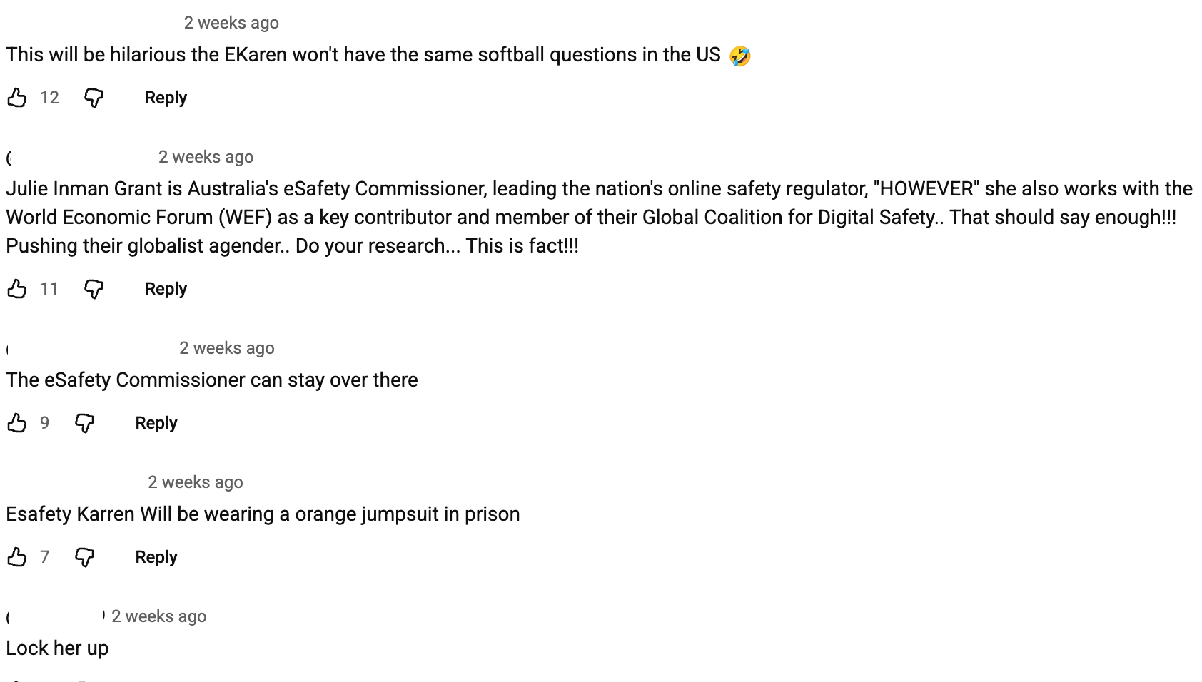 Since that paper was published, Julie Inman Grant has been targeted—like me and other advocates for a safer internet—by Republican Jim Jordan, who called her a “zealot” for doing her government-appointed job. Jordan falsely claims she is attempting to infringe on Americans’ rights to access political content and is seeking her testimony in his politically-motivated “Subcommittee on the Weaponization of the Federal Government”. The gendered narratives we saw in our 2024 research persist. Check out the comments on a SkyNews video related to Jordan’s request: