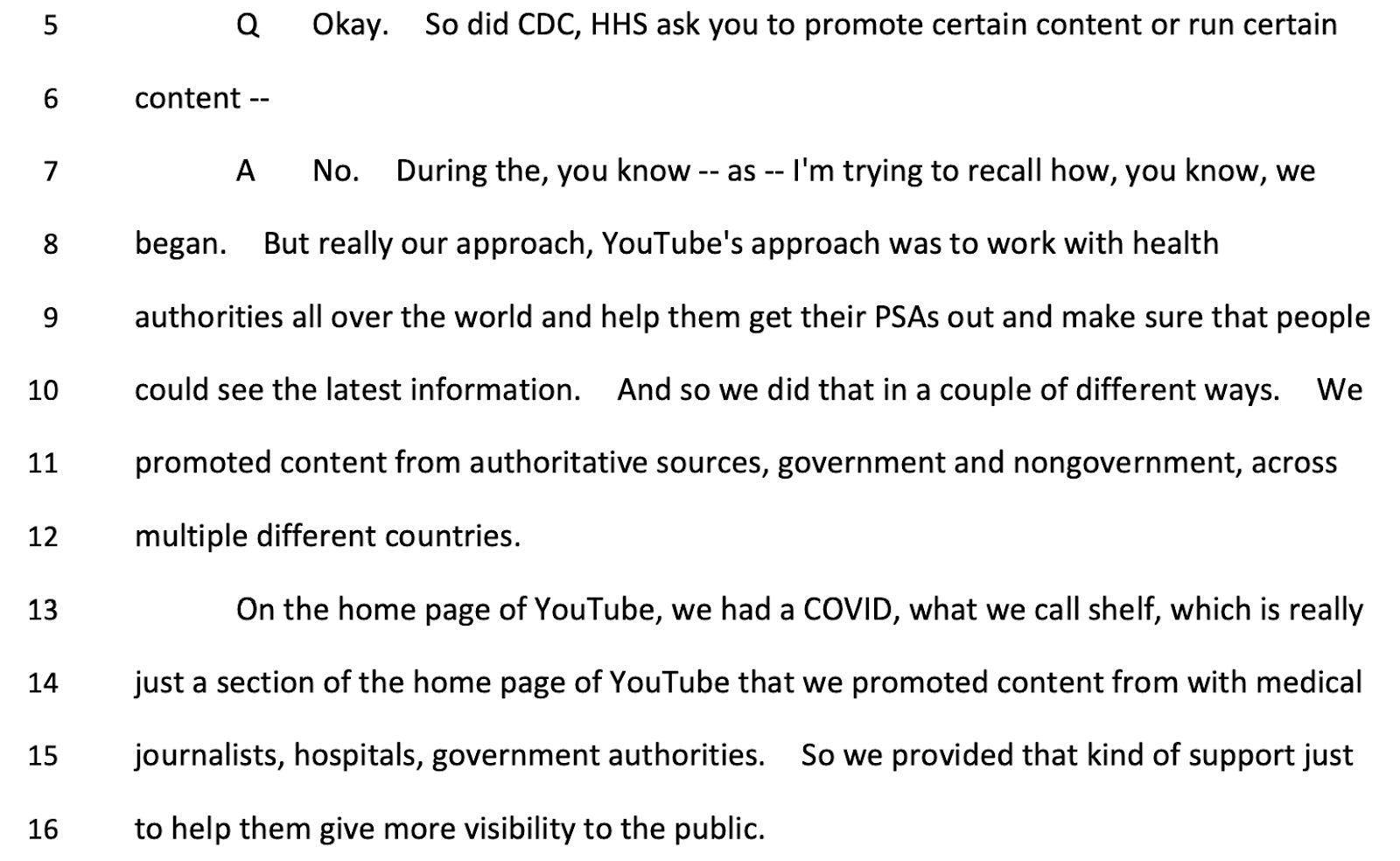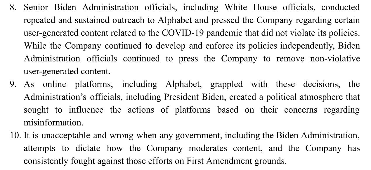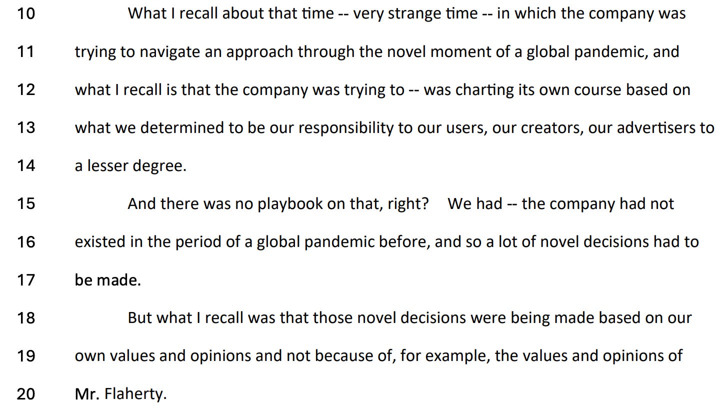 They also confirmed, over and over and over again, that they never felt coerced, threatened, or even, as Alphabet’s letter asserts, “pressed” by the Biden White House. Here’s a YouTube Public Policy Manager, who interfaced directly with White House officials.