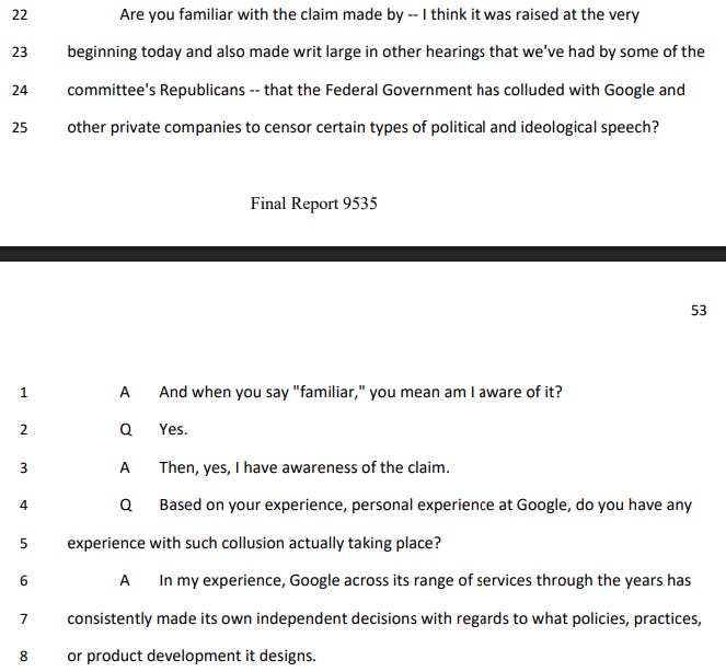 Google execs’ interviews before the House Judiciary Committee show no evidence of “censorship” or government coercion - so who’s lying?