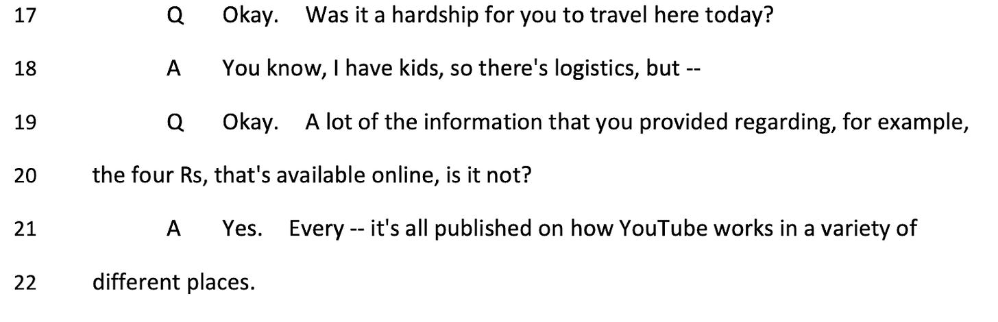 Frequently, they hauled in individuals who had nothing to do with content moderation, such as Google’s former AI Principles Operations & Governance Lead or YouTube’s Director of Health Partnerships. They clearly thought they had bagged a big fish with the latter—they had “health” in their title, and they were working at YouTube, so they assumed they were happily censoring every day—but it turned out this person’s job was almost entirely focused on helping surface authoritative information to users who were looking for it.