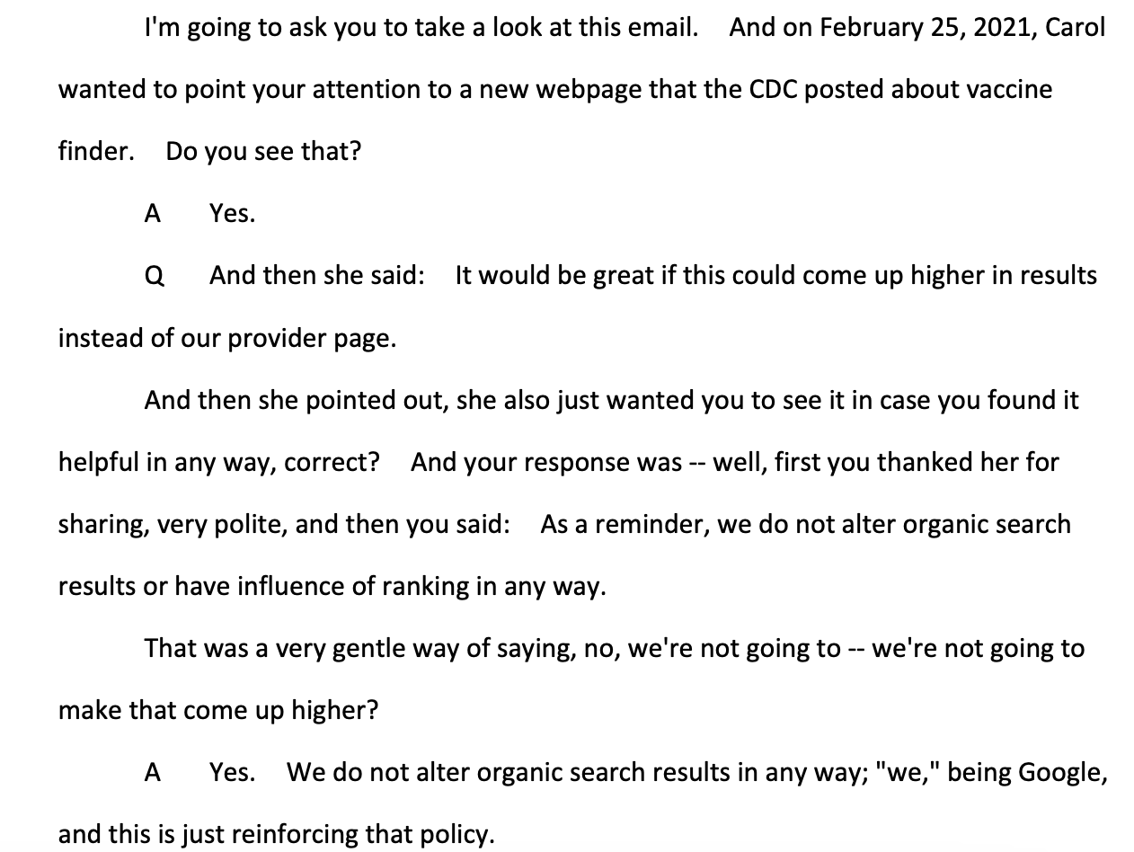 As I read through the transcripts, what stood out to me (other than the complete disregard for the truth that Jordan and other proponents of the censorship lie have shown over the past few years) was the enormous waste of taxpayer resources Jordan’s witch hunt has been. Most of these interviews spend hours establishing Google’s organizational chart: Who’s your boss? Who are your reports? Do you talk to the CEO? Did they all do censorship with you?