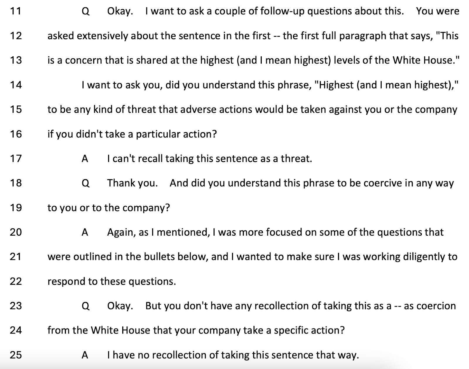 He and his staff dropped nearly all of the transcripts in a 17,000-page report at the end of 2024. The PDF of the transcripts is unindexed and difficult to navigate, which I would wager is intentional. The GOP didn’t want anyone to read them, since they so clearly undermine the censorship lie, which has underpinned MAGA’s long list of grievances since 2020. I’m sure nobody (except maybe the committee staff) read them all. Until today.